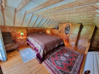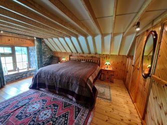 Bedroom complete with solid timber flooring, feature exposed stone wall with side aspect window overlooking the vegetable garden area, exposed ceiling beams, walk-in attic access and built-in storage units.