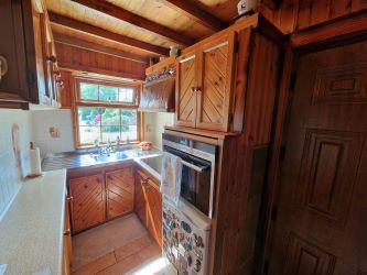 Kitchen is complete with tile flooring, built in wall and floor storage units, integrated electric oven, hob and extractor, undercounter fridge space, splash back tiling and large sink area under the side aspect window. Timber cladded ceiling and wall panelling with rear aspect door.