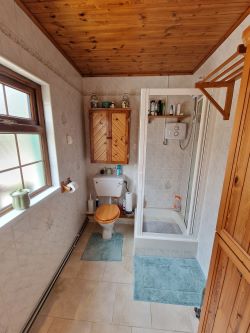 Fully tiled shower room complete with timber clad ceiling, wc, wash hand basin with an overhead wall mirror and lighting, corner shower unit and a rear aspect window.