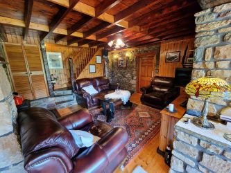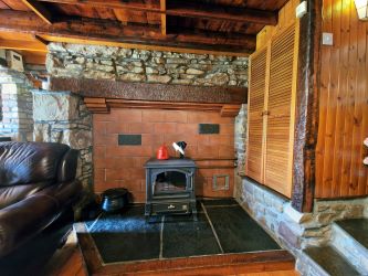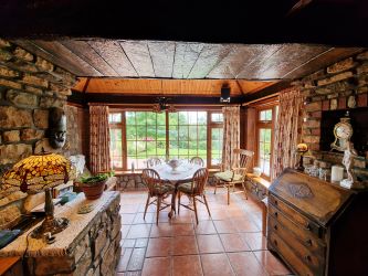 Main reception room situated in the heart of the home complete with fantastic solid bog oak beams, exposed stone and brick walls and timber cladding in place. Solid timber floor and a feature large solid fuel stove which is complete with a back boiler to offer dual heating system. Built in TV unit with display shelving and storage units with stairs to first floor bedroom complete with under stairs storage. To the front is a tiled floor dining area section complete with vaulted timber cladded ceiling and large front and side aspect windows overlooking the gardens offering an abundance of natural daylight.