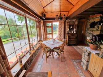 Front entrance double doors leading into this fantastic bright room with wrap around windows to the front overlooking the private garden and fields. This room is complete with electric underfloor heating and tile flooring while giving access into the main rooms of the house.