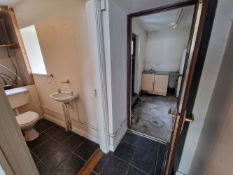 Tiled floor connecting the main shop to the WC and rear kitchenette area.