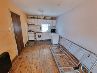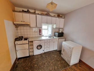 Open plan kitchen/living space with both front and rear aspect windows, built in wall and floor units with splashback tiling, plumbing for washing machine, lino floor in kitchen with solid timber flooring into the living/dining space and front aspect window.