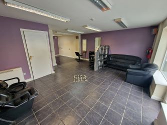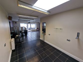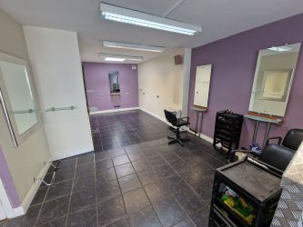 L shaped designed open plan ground floor space, tiled flooring throughout, large front aspect windows currently set up with different hair dressing stations with water connections and an abundance of power points and lighting.