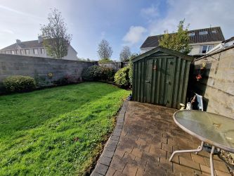 Off street parking to front on tarmac drive with part lawn area and gated access to rear garden. Paved outdoor dining area to rear with remainder laid to lawn. Raised flowerbeds to side and rear boundary with sleepers in place. Garden storage shed.