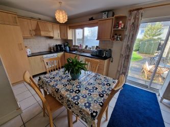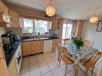 Open plan kitchen dining room to the rear of the property complete with tile flooring throughout, rear aspect window and patio door leading to the outdoor dining space and rear garden. Kitchen complete with built in wall and floor units, splash back tiling and an integrated electric oven and hob with plumbing for a dishwasher in place.