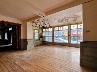 Front Bar / Restaurant Room 8.2m x 6.6m (26'11" x 21'8"). 3 large windows to the front, timber flooring, decorative high ceilings (3.2mt) original fireplace, timber half wall panelling, large doors open into the main bar.