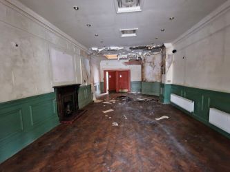 Formal Function Room 11.5m x 5.4 (37'9" x 5.4). High ceilings, parquet flooring (partly lifting), half wall panelling, cast iron fire place, decorative ceiling coving and access to a flat roof extension area that needs complete renovation.