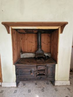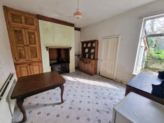 Complete with lino Flooring, rear aspect window, built in storage cupboard, solid fuel range with timber cladded surround and timber mantle piece.