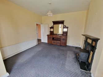 Large reception room complete with carpet flooring, bay-style front aspect window, solid fuel stove with antique fireplace surround.