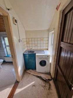 Complete with lino flooring, single bowel and drainer sink with splash back tiling and built in storage unit in place. Space and plumbing for washing machine, side aspect window and doors to both shower room and rear garden.