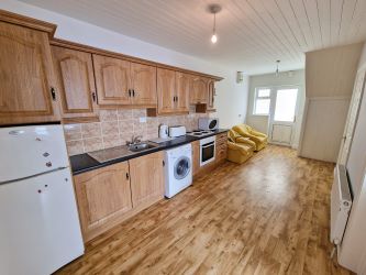 With door to outdoor stairs, rear aspect window , tile effect lino flooring and kitchen area complete with wall and base units, space for a fridge freezer, single bowl and drainer sink with mixer tap, integrated oven with overhead electric hob and extractor hood and fan and space an plumbing for washing machine and splash back tiling.