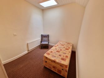 With carpeted flooring, front aspect window, timber cladded ceiling with centre feature.
