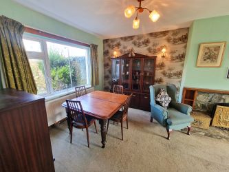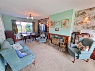 Large room spanning the depth of the property with both front and rear aspect windows offering an abundance of natural day light. Carpet flooring, door from hallway and kitchen/dining room with wall lighting and solid fuel open fireplace with a marble and timber decorative surround.