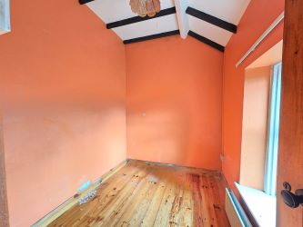 High ceilings with exposed beams, dual aspect windows to the front and side, built-in wardrobes with indentation for bed and additional overhead storage, cast iron solid fuel fireplace with stone flag.