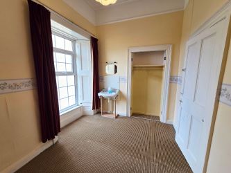 Large room, dual aspect windows to front and side, carpeted flooring, high ceiling, decorative ceiling coving, built-in storage and sink unit.