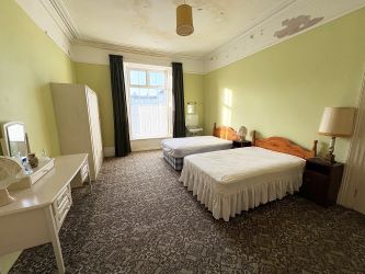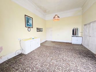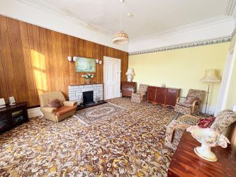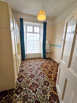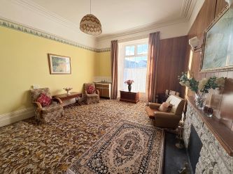 Carpeted flooring, decorative celling coving, high ceiling, front aspect window, built-in sink unit, decorative architraves and skirting, sold fuel fireplace with stone surround and door leading to bedroom six / reception room.