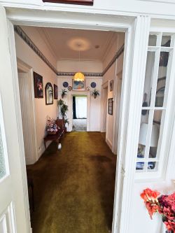 Timber flooring with carpeted center runner, high ceiling and doors to bedroom one, two, three and four with decorative architraves.