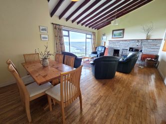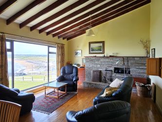 Timber flooring, raised solid fuel fireplace with stone surround on Liscannor flag, ceiling to floor head hight with decorative timber ceiling beams, port hole to the kitchen and large window overlooking Lahinch beach with stunning views.