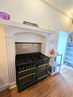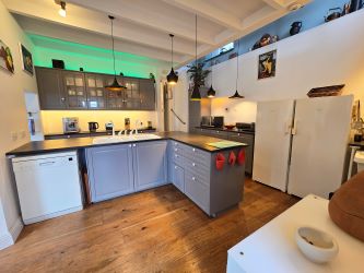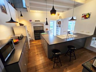 Timber flooring, built-in wall and base units with ample work surfaces, double sinks, space and plumbing for elctricial appliances, 5 ring gas hob with ornate timber surrond, full lenght glass door leading to decking area, ceiling to floor head hight with decorative lighting and steps leading to walk-in pantry area.