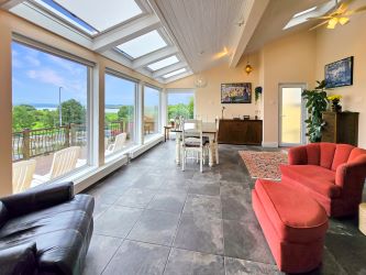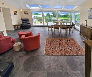 Tile flooring, 4 large dual aspect windows to rear and side with Shannon Estuary views, 4 velux windows, timber clad ceiling, raised solid fuel stove, open built-in display unit between living room and kitchen, side door access and open door access to kitchen.