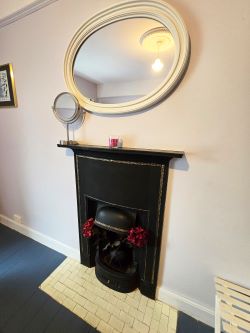 Painted timber flooring, high dado rail, center rose feature to light fitting, open fire place with cast iron surround, front aspect window and door to en-suite.