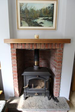 Maple style timber flooring, solid wood surround feature fireplace with brick insert and solid fuel stove with tile and brick base, decorative ceiling coving, dado rail with half and half wall decor and TV point.