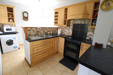 Kitchen Area - with modern maple style built in wall and base units with ample work surfaces, single drainer sink with mixer tap, extended breakfast counter, space and plumbing for electrical appliances, ceramic tile flooring, tile splashback surround and eye level glass display units with exposed shelving, recess ceiling lighting and door leading to rear gardens.