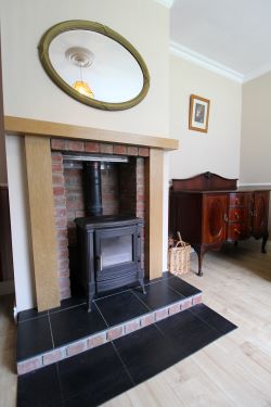 Dining Area - with quality tile flooring, built in fireside units with eye level display and ample surfaces, brick surround feature fireplace with solid fuel stove insert and flag base with solid oak mantle. Open plan to kitchen area.