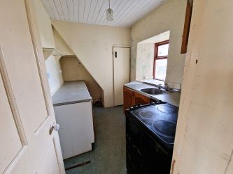 Galley style Kitchen with integrated sink, space for a cooker, fridge freezer with counter top space and there a small staircase access to a small attic storage space. to the rear is an extension.