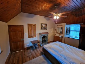 Solid timber flooring, timber cladded ceiling and a side aspect window. Currently fitted with two double beds in the upstairs garret bedroom of the cottage