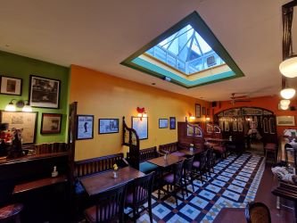 Restaurant Area - set up in booths, tiled flooring, room is drenched in light from a large velux window on the roof.