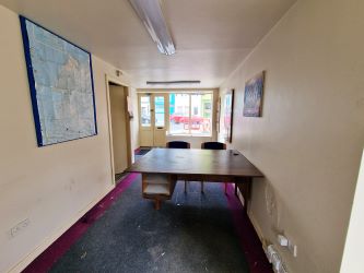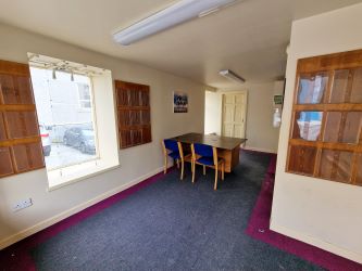 Ground Floor 7.7m x 2.3m (25'3" x 7'7"). Accessed from the main street and also rear door access. Full length glass windows frontage and front door also window frontage to the side offering excellent light. Carpeted flooring, stairway to basement also door to the rear which has a further door opening out on to the back area.