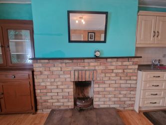 This open plan kitchen/living/dining space is complete with laminate timber flooring, front aspect window, feature solid fuel open fireplace with brick surround, kitchen complete with wall and floor units with splash back tiling and excellent worktop space. Access to all other rooms off the living space.
